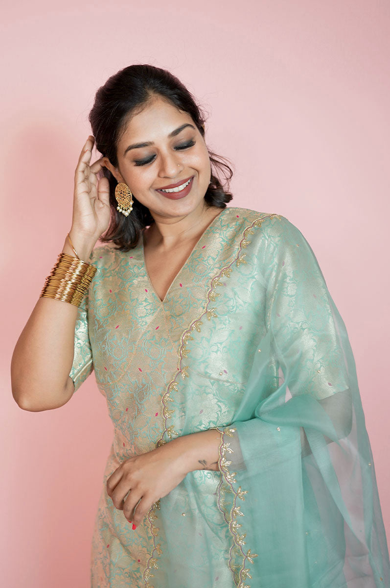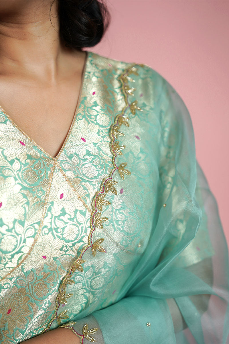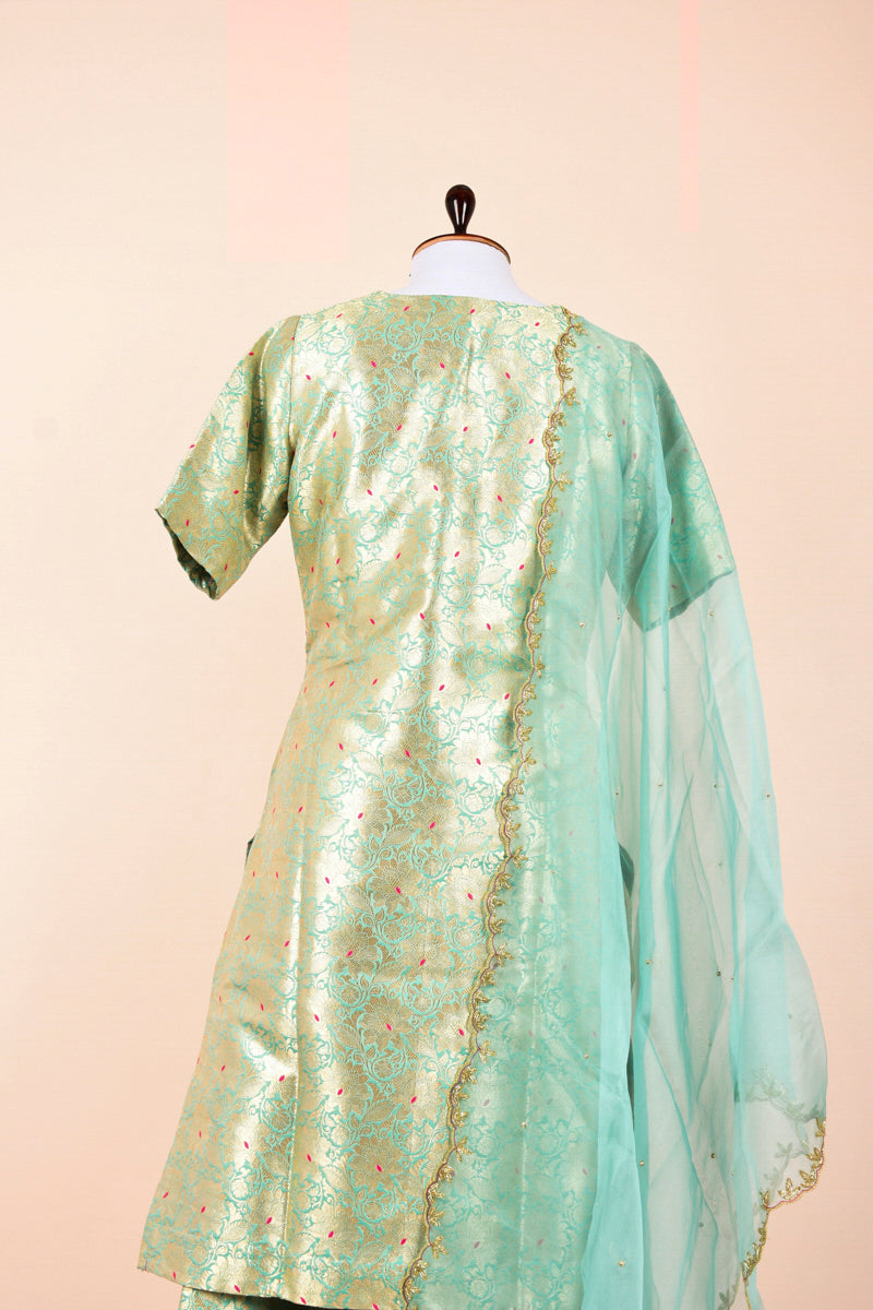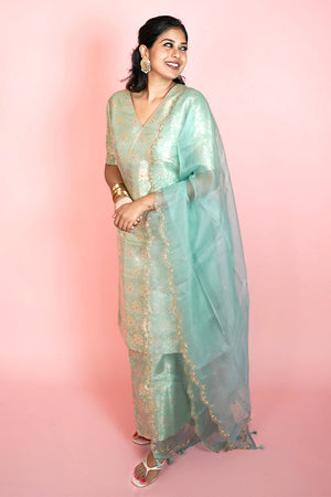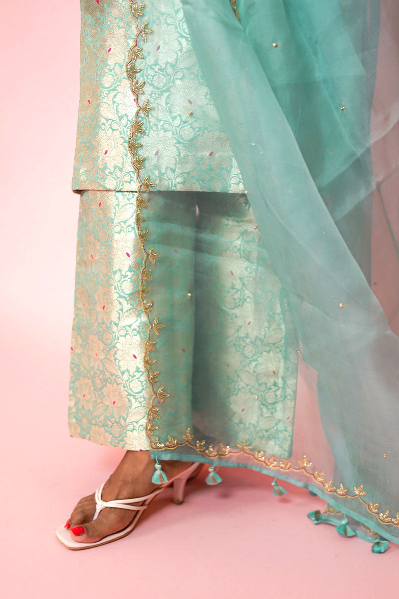 Features: It has gold zari woven meenadar floral jaal all over it has katdana handwork over neckline comes with a zardozi embroidered scalloped organza silk dupatta with matching palazzo pants.