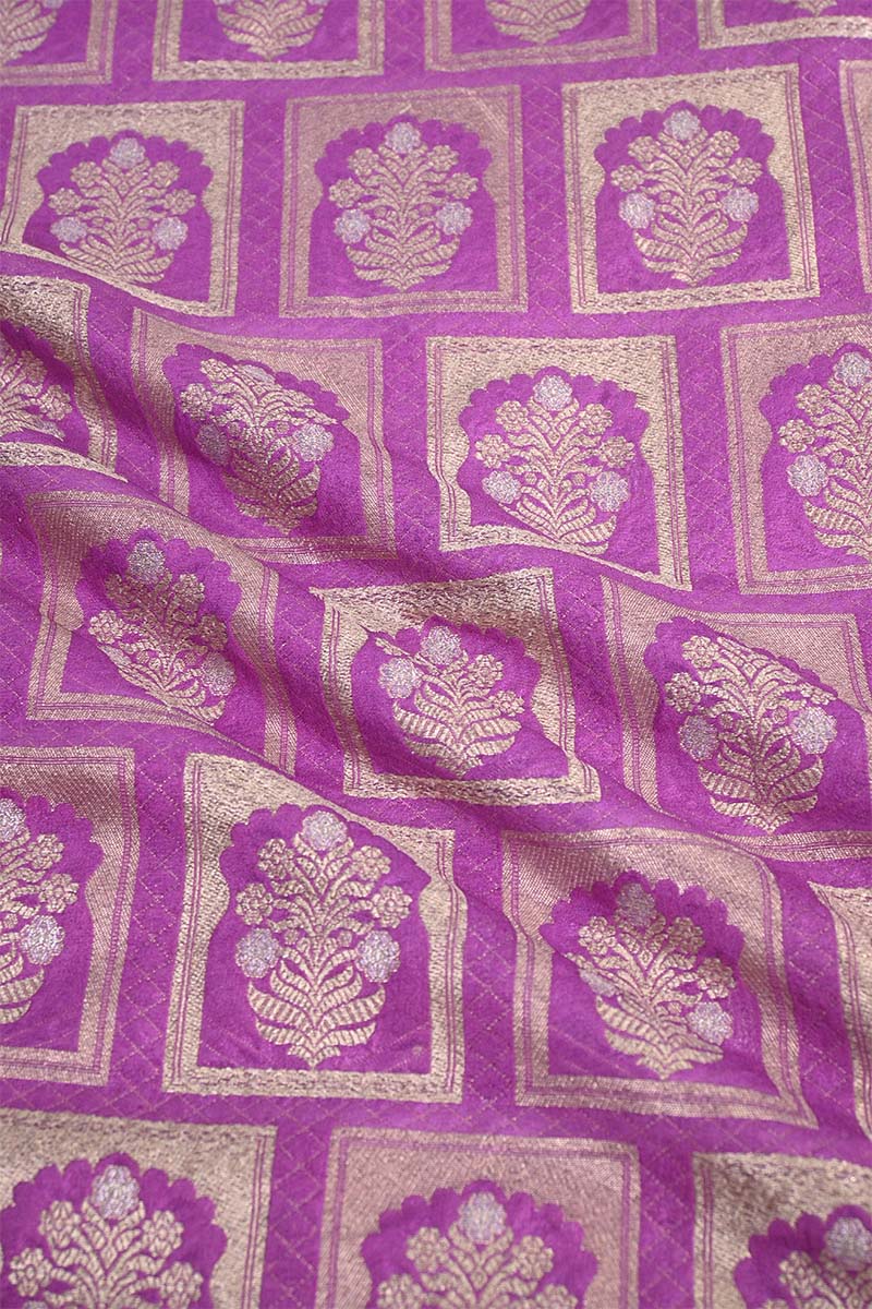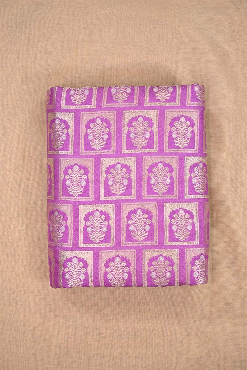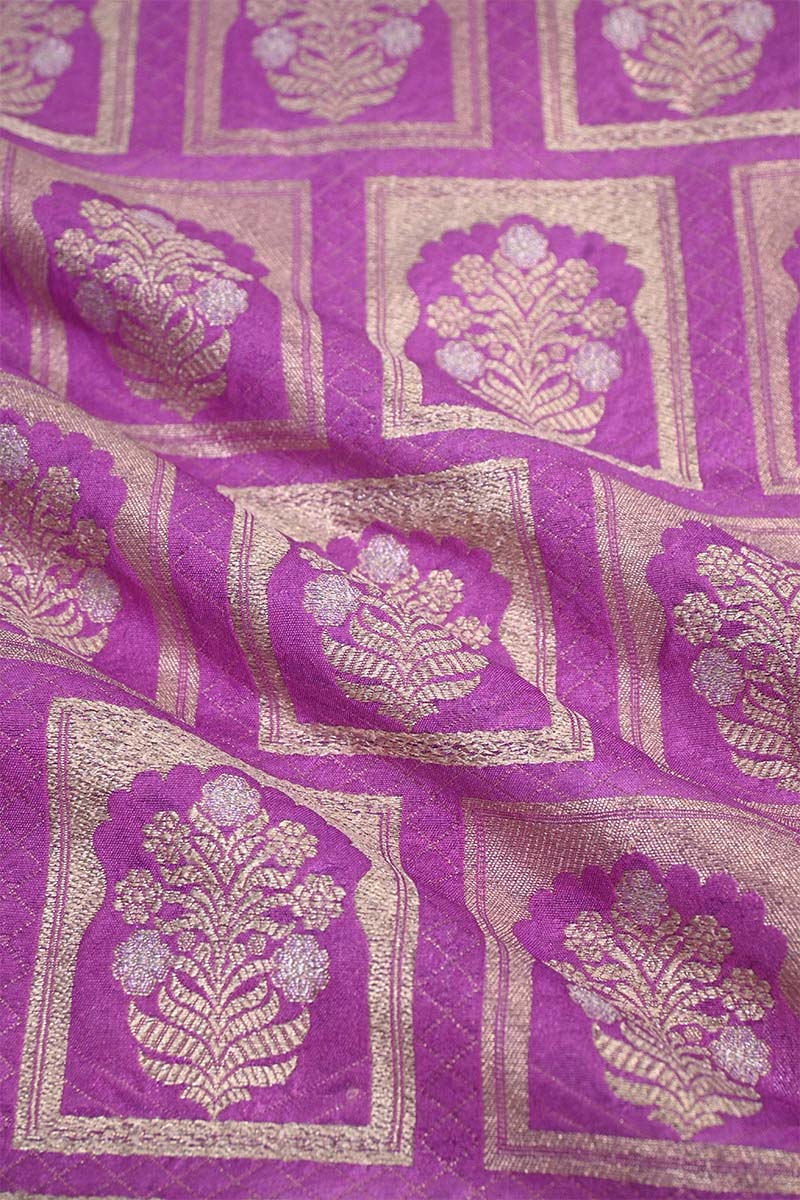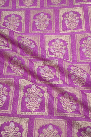 This Violet Banarasi silk fabric features an intricate pattern inspired by Rajwada floral ornament architecture, woven with gold and silver zari throughout the fabric. The combination of delicate motifs and dual-tone zari makes it an excellent choice for stunning blouses or dresses.