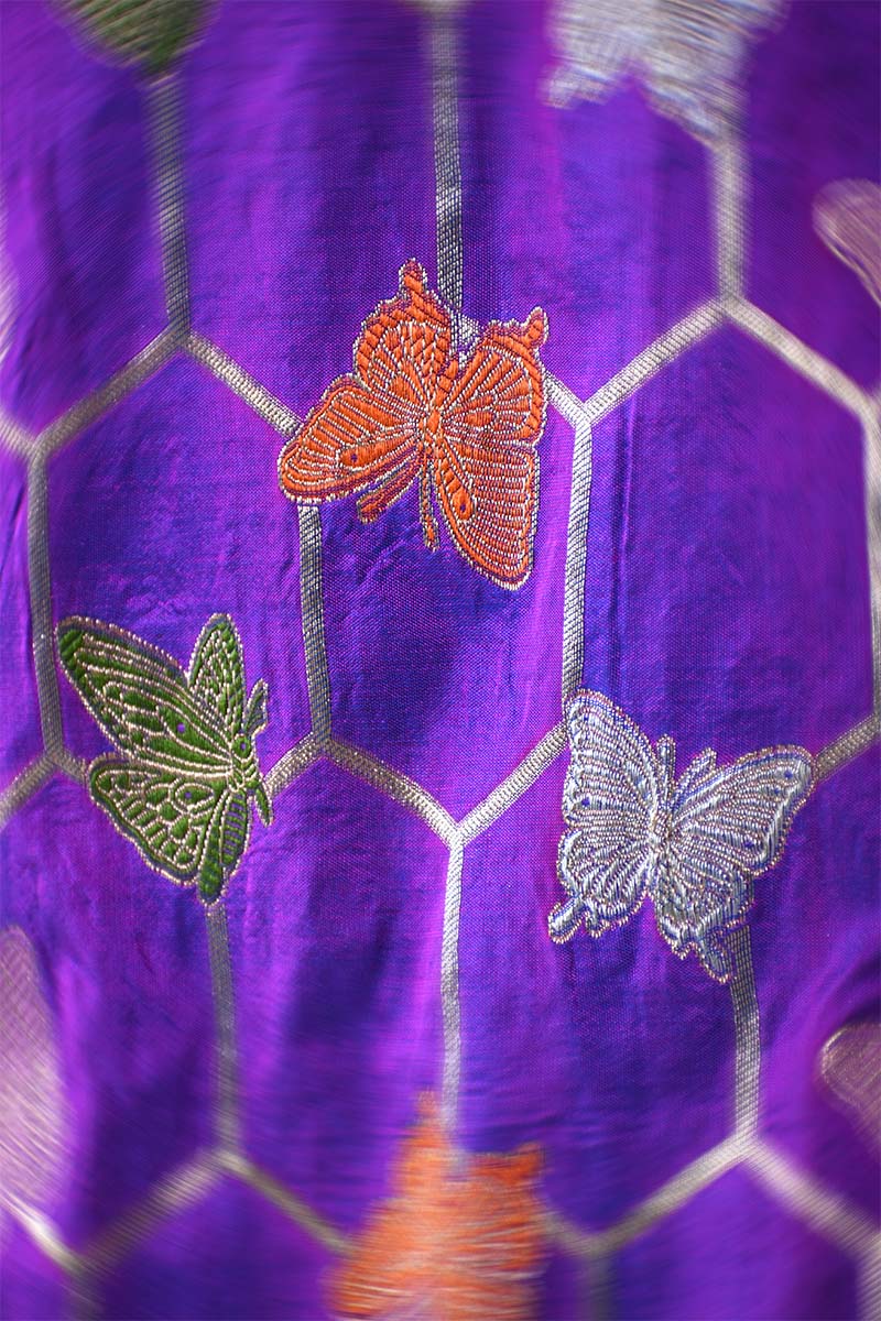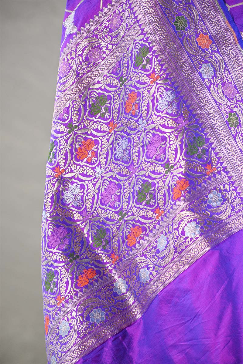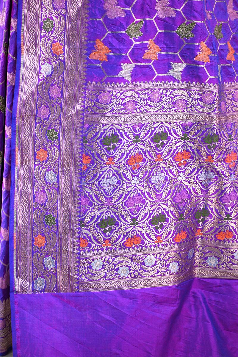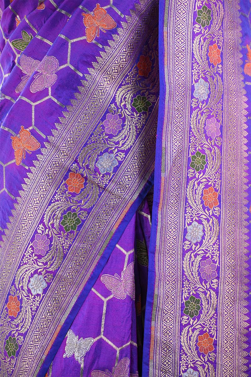This violet pure Banarasi katan silk saree is designed with gold zari woven geometric hexagonal jaal and highlighted with multicolor resham butterfly meenakari motifs weaving across the body. The border and pallu are intricately woven with floral patterns in gold zari, further enhanced by meenakari resham work. It is paired with a matching plain unstitched blouse piece finished with a zari and meenakari woven border.