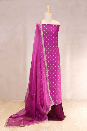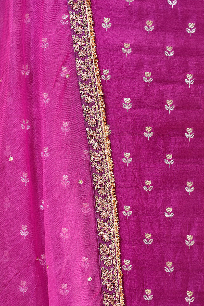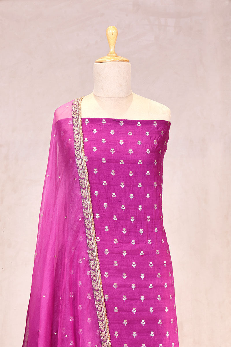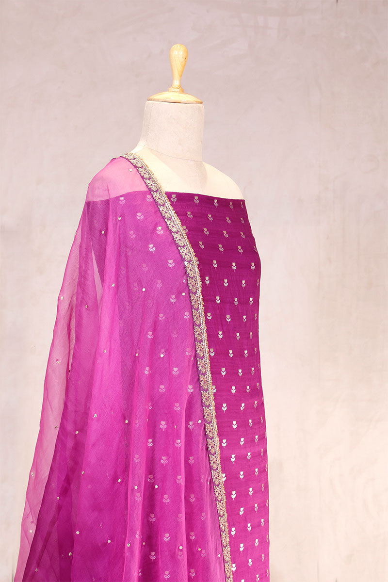 This Violet Chiniya silk suit set is a premium choice for festive celebrations and cultural gatherings. The kurta is adorned with water gold zari woven floral buti all over, adding a subtle shimmer. Paired with an embellished organza silk dupatta and a matching running bottom pant, this dress material offers a well-coordinated look perfect for special occasions.