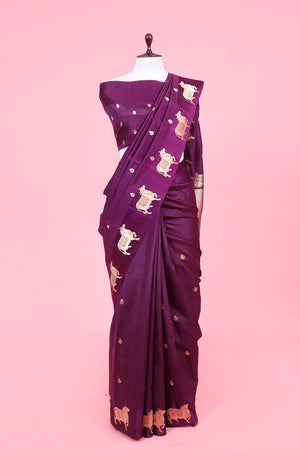This violet Banarasi silk saree features intricately woven light golden zari Pichwai Aghanya cow motifs on the 5 Kadhi satin silk border. The body of the saree is adorned with small floral motifs in zari, creating a detailed and balanced look. The pallu is woven in a light golden zari brocade pattern, adding to the overall richness of the saree. It is paired with a matching unstitched blouse fabric for custom blouse styling.
