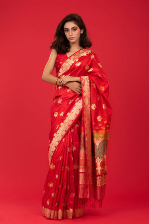Display your classy side at the next important event by donning this beautiful red saree. Highlighting tested gold zari which features genuine gold embellishments, ensuring its enduring brilliance over time.Kadhwa woven floral meenakari buta and tested gold zari ethnic handwoven border with tanchoi handwoven meenakari pallu, this saree is a masterpiece. Made of quality katan silk fabric, this saree has a distinct sheen and a lovely finish that cannot be missed.