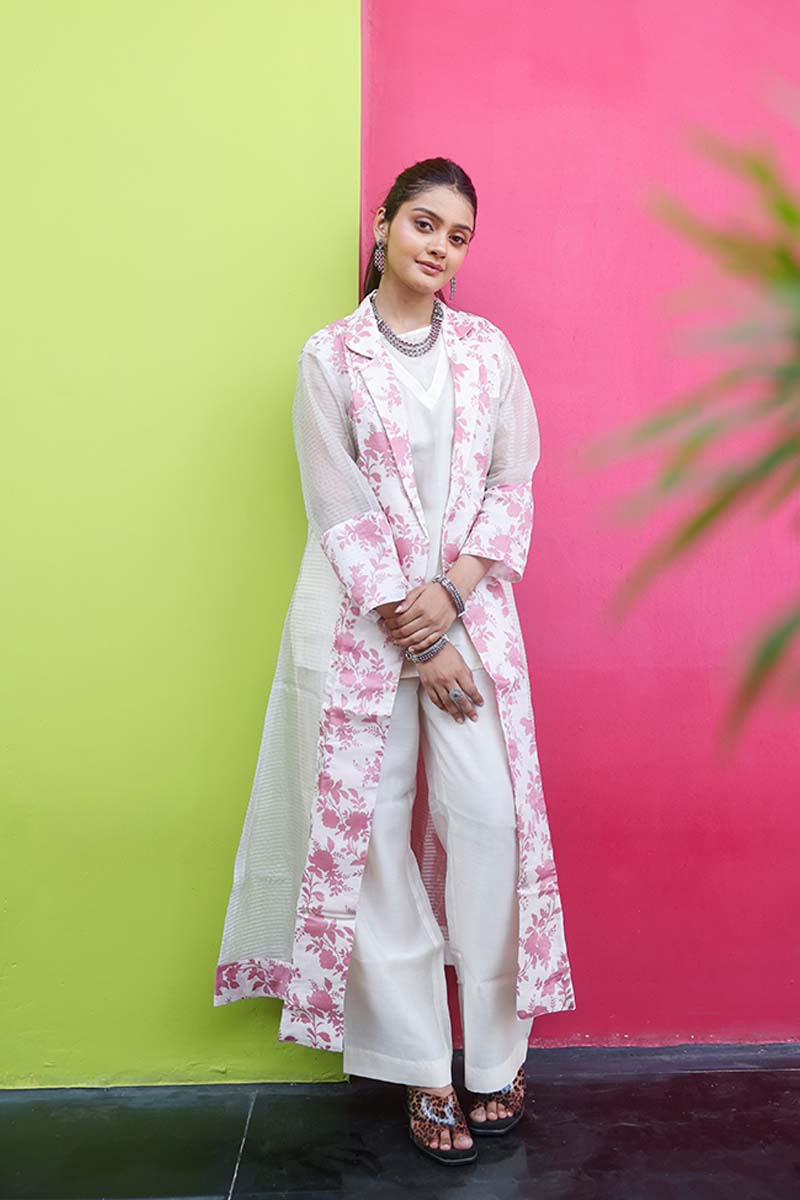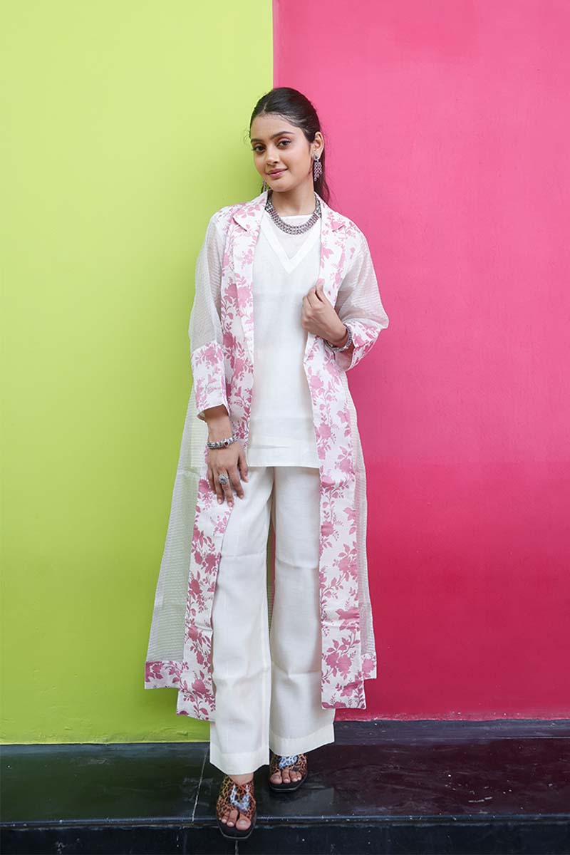 This white and pink modal cotton silk co-ord set is a refreshing blend of comfort and understated elegance. The plain cotton-silk inner top offers a soft, breathable feel, while the pink digital-floral printed organza shrug with 3/4th sleeves adds a graceful layer of style. Completing the ensemble, It is paired with coordinated ankle-length pants made from white cotton silk fabric, completing the set with a refined and cohesive appearance.