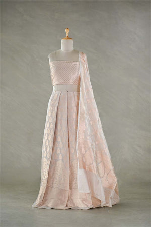 This White Banarasi Katan silk lehenga is specially designed for the bride's sangeet ceremony, woven with gold zari flower buta and intricate floral detailing. It is paired with a matching blouse piece and a richly detailed Banarasi dupatta, it offers versatility as the dupatta can be dyed in a color of your choice.