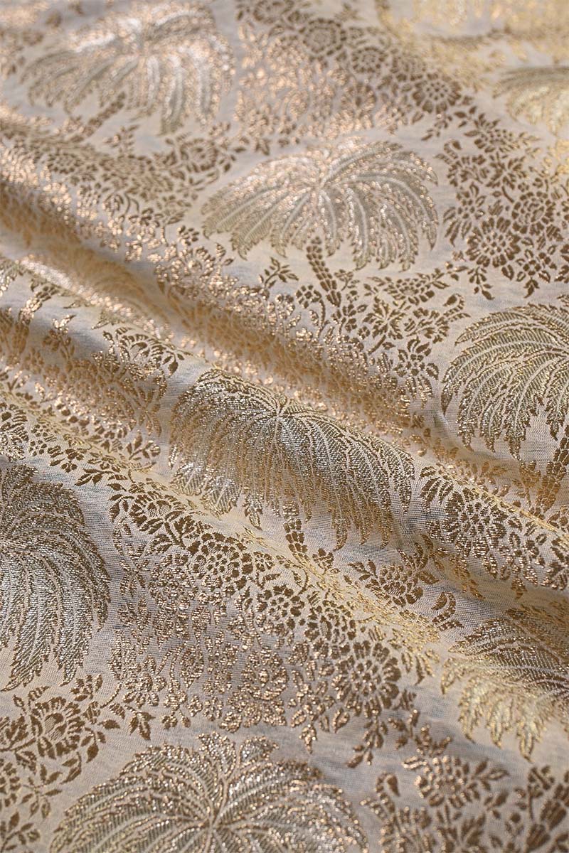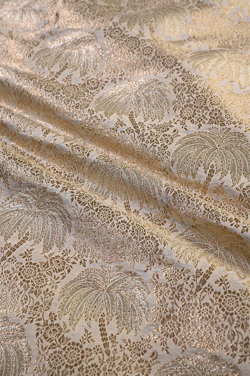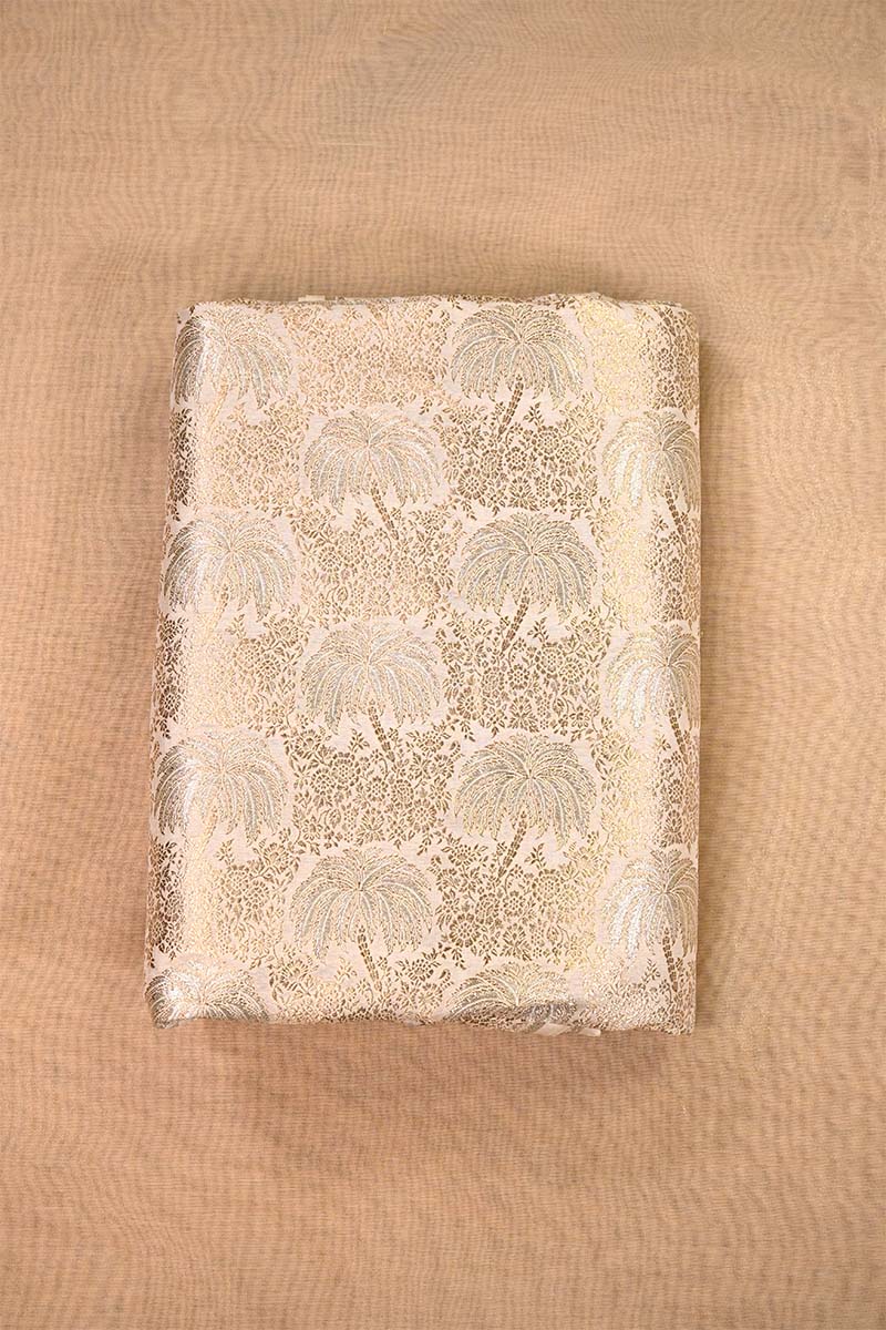 This White Banarasi silk fabric features an intricately designed floral jaal pattern woven with gold zari. The fabric is further enhanced with distinctive coconut palm tree motifs in gold and silver zari, thoughtfully placed within the jaal design to add character and charm.