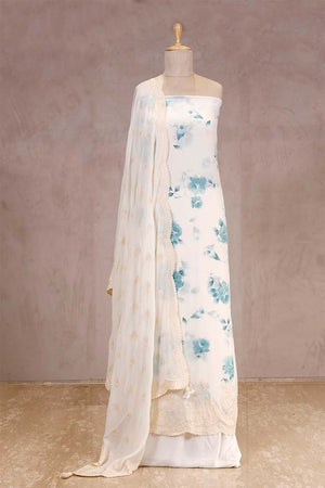 This white & blue chiffon silk suit set is a graceful choice for festive occasions and cultural gatherings. The kurta is adorned with a delicate floral print all over, while the hemline is enhanced with intricate resham embroidery, adding subtle detailing. Paired with an embroidered dupatta and a matching bottom pant, this dress material offers an effortlessly refined look for special events.