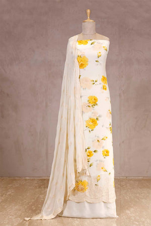 This white chiffon silk suit set is a graceful choice for festive occasions and cultural gatherings. The kurta is adorned with a delicate floral print all over, while the hemline is enhanced with intricate resham embroidery, adding subtle detailing. Paired with an embroidered dupatta and a matching bottom pant, this dress material offers an effortlessly refined look for special events.