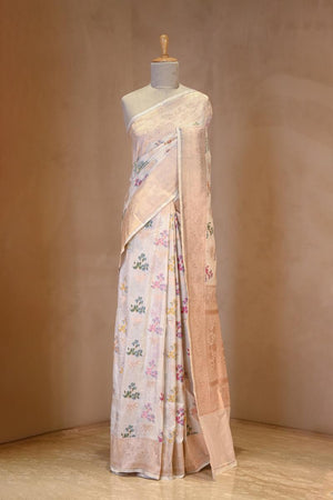 This white pure Katan silk saree features finely crafted floral butas woven with resham meenakari and gold zari work across the body. The border is adorned with a gold zari brocade floral pattern, while the pallu is designed with intricately woven floral butas set over a gold zari brocade base. It comes with a matching white unstitched blouse fabric finished with a gold zari woven border.