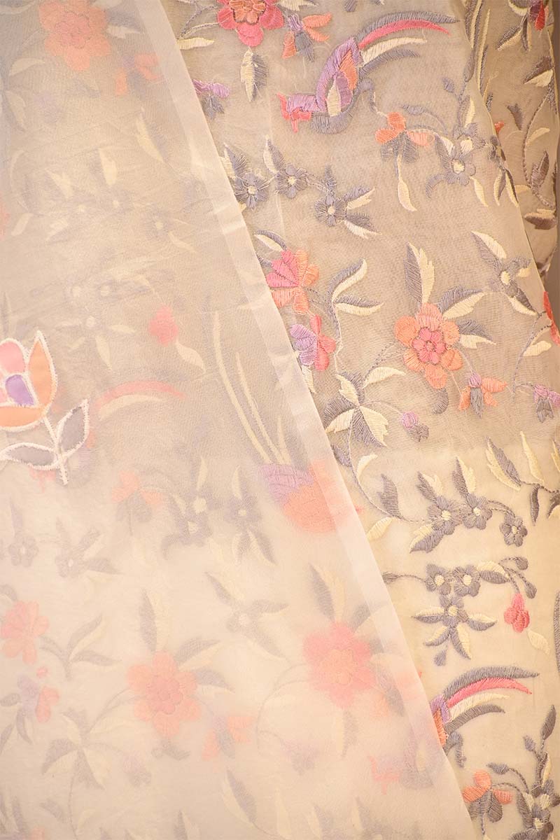This white embroidered organza silk suit set is designed for festive occasions and cultural gatherings. The kurta features resham embroidered floral and bird jaal all over, including the hemline, adding detailed patterns to the fabric. It is paired with a plain floral embroidered dupatta and comes with a matching bottom pant, making this dress material a complete ensemble.