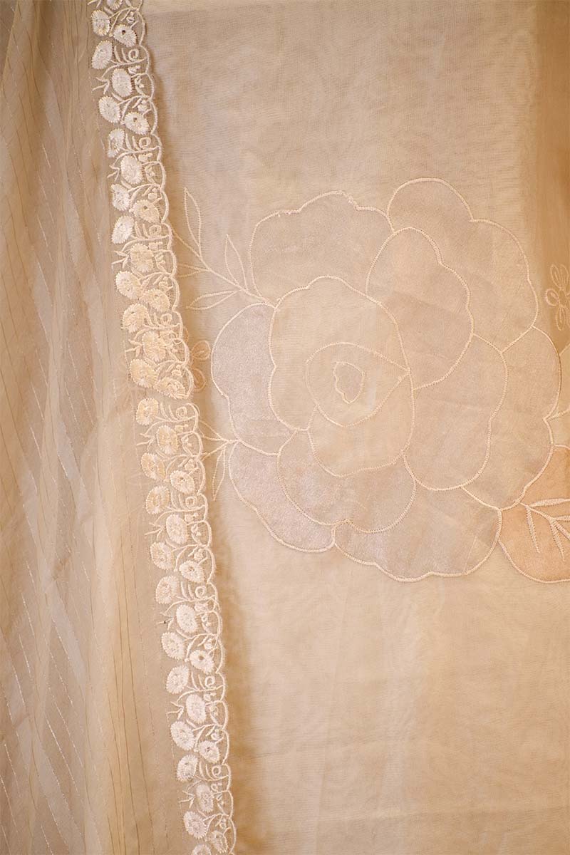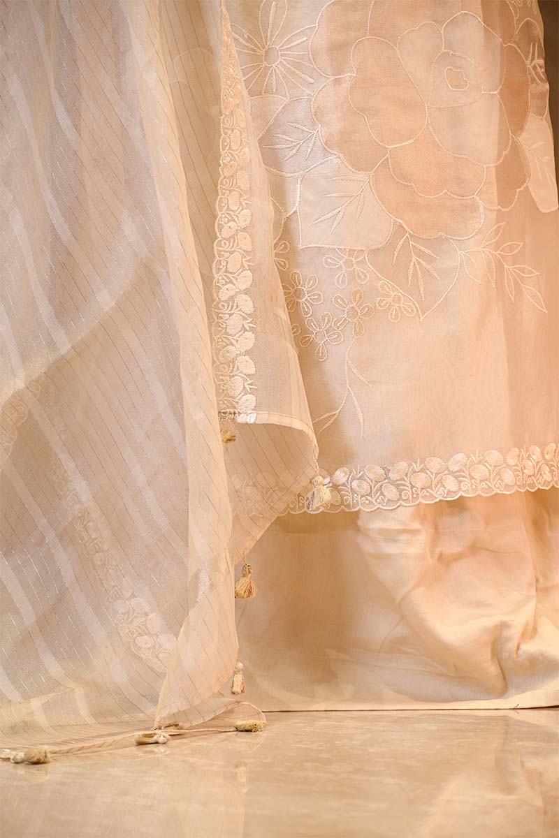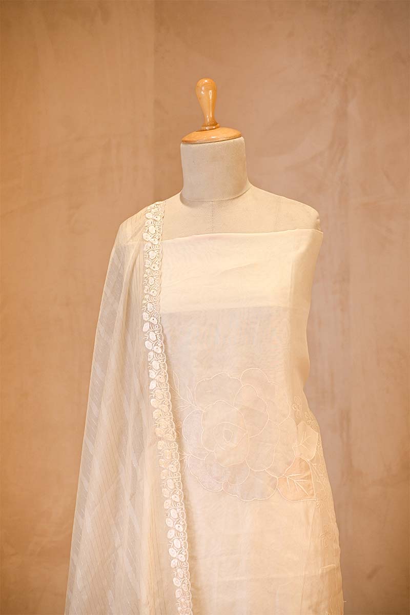 This white organza silk suit set features floral tissue appliqué and fine thread work all over the kurta, beautifully highlighted with a floral resham embroidered border along the edges. The look is completed with an organza silk dupatta adorned with golden zari woven stripes and resham floral embroidery, adding texture and detail. The set comes with a matching unstitched plain bottom fabric for easy customization.