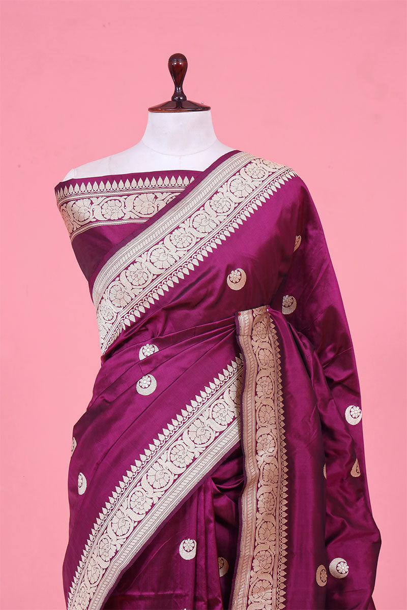 This wine katan silk saree is handloom woven with water gold zari chand buta motifs scattered all over the body. The saree is further enhanced with a beautifully woven water gold zari border and pallu, giving it a regal look. It comes with a running unstitched blouse piece, making it an ideal choice for traditional and festive occasions.