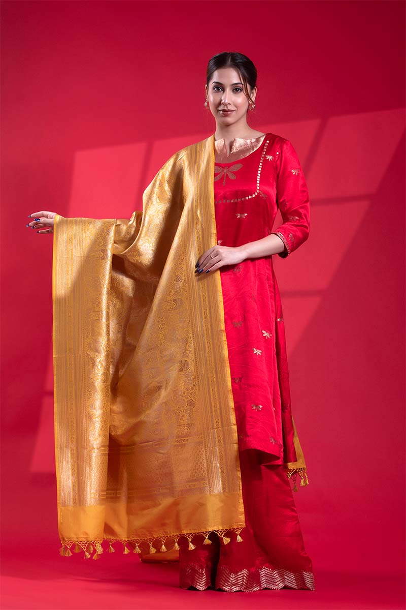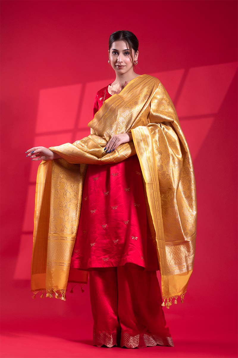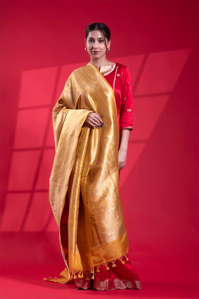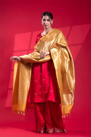 Tips: Pair this yellow Banarasi Katan silk dupatta with a matching yellow kurta for a vibrant wedding look or choose a contrasting maroon kurta for a regal combination.