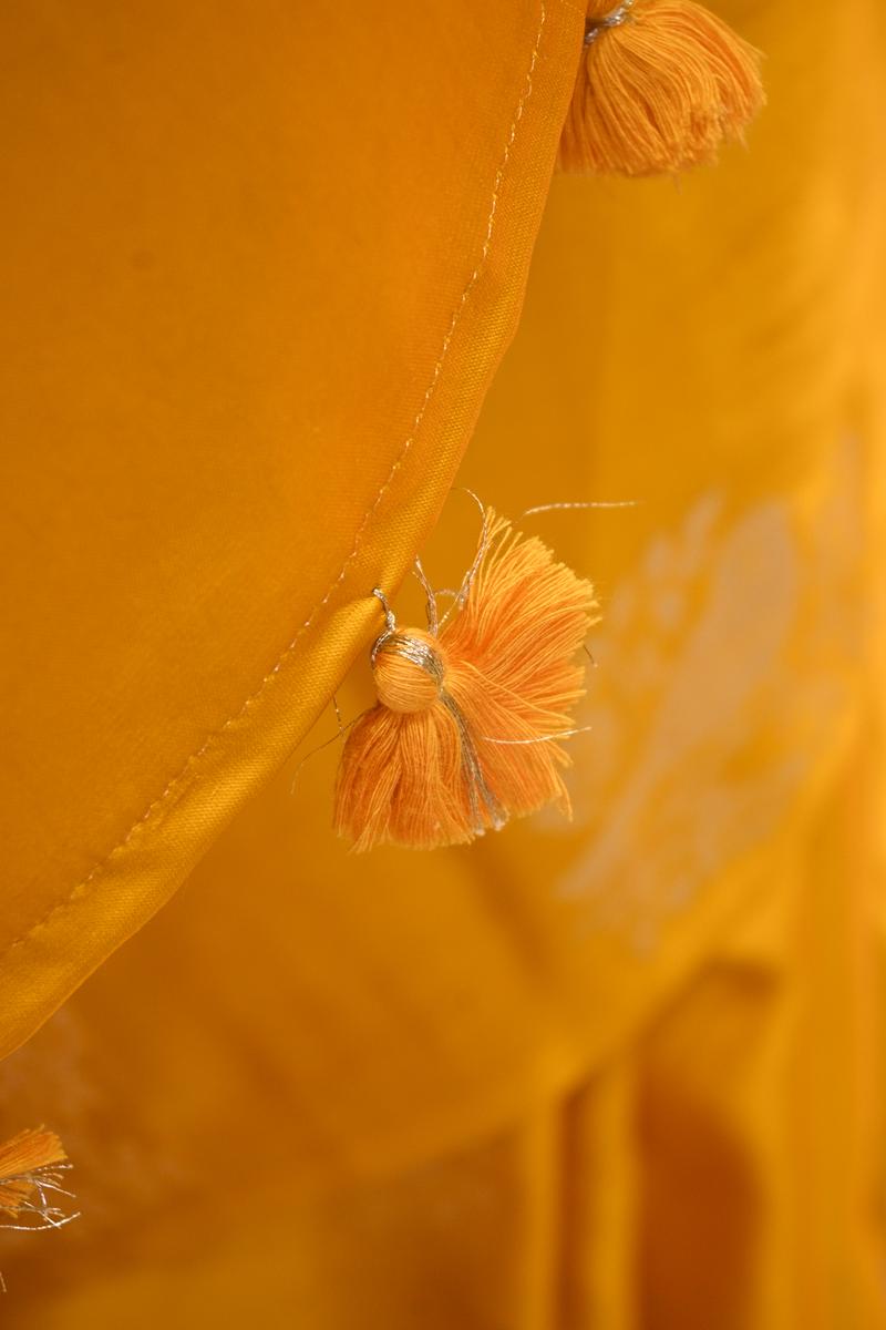 • Blouse Details: Matching yellow blouse fabric with small floral sona-rupa motifs and bird border