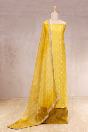 This Yellow Chiniya silk suit set is a premium choice for festive celebrations and cultural gatherings. The kurta is adorned with water gold zari woven floral buti all over, adding a subtle shimmer. Paired with an embellished organza silk dupatta and a matching running bottom pant, this dress material offers a well-coordinated look perfect for special occasions.