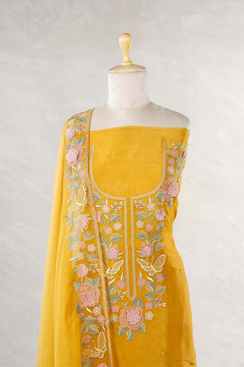 This yellow organza silk suit set is suitable for festive wear and wedding functions. The kurta features resham woven floral jaal embroidery around the designer neckline, along with resham woven buti spread across the fabric. It is paired with a matching organza silk dupatta detailed with resham woven floral border. A matching unstitched silk bottom fabric completes this dress material set.
