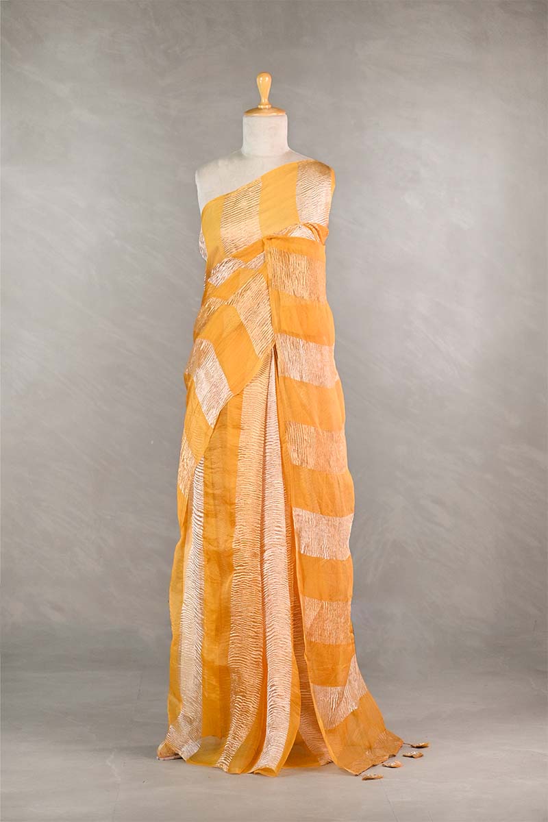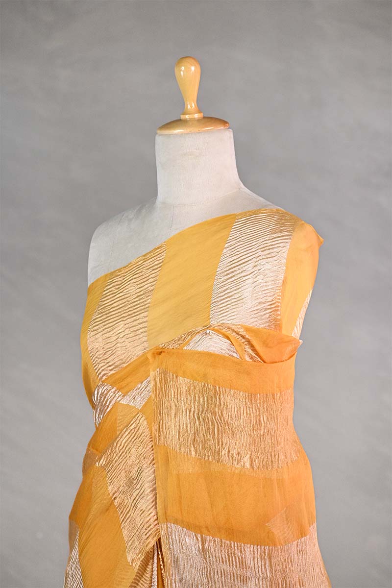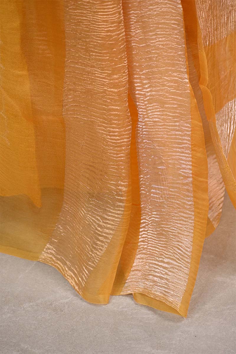 This yellow pure organza silk saree is designed with crushed tissue gold and silver zari woven stripes for a contemporary appeal. It is paired with a matching unstitched blouse piece embellished with pitta zari work for custom stitching.