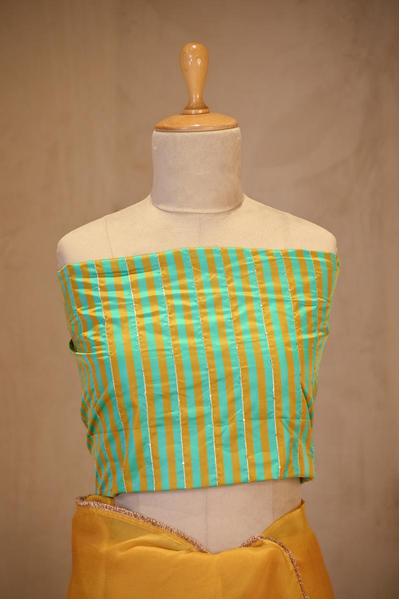 • Blouse Details: Satin silk blouse fabric with yellow-green stripes and aari hand-embellishments
