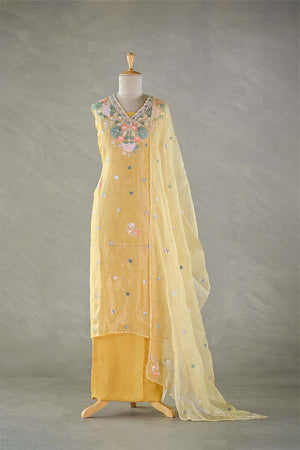 This baby pink embellished tissue silk suit set is a perfect choice for festive occasions and cultural celebrations. The kurta features a V-shaped neckline adorned with floral resham hand embroidery and mirror work embellished motifs throughout, creating a captivating design. Paired with a organza silk dupatta highlighted by mirror work detailing and resham emberoidery, the set is completed with a plain silk matching pant for a polished and coordinated look.