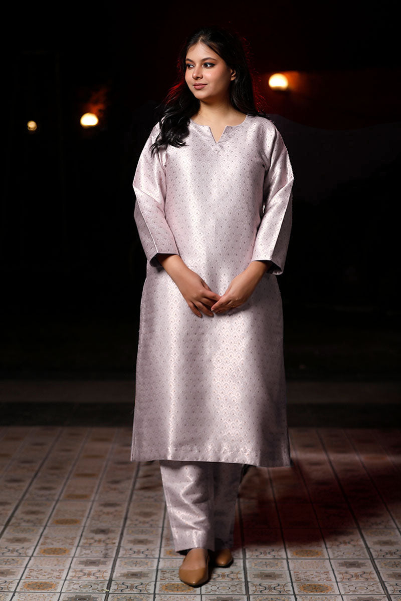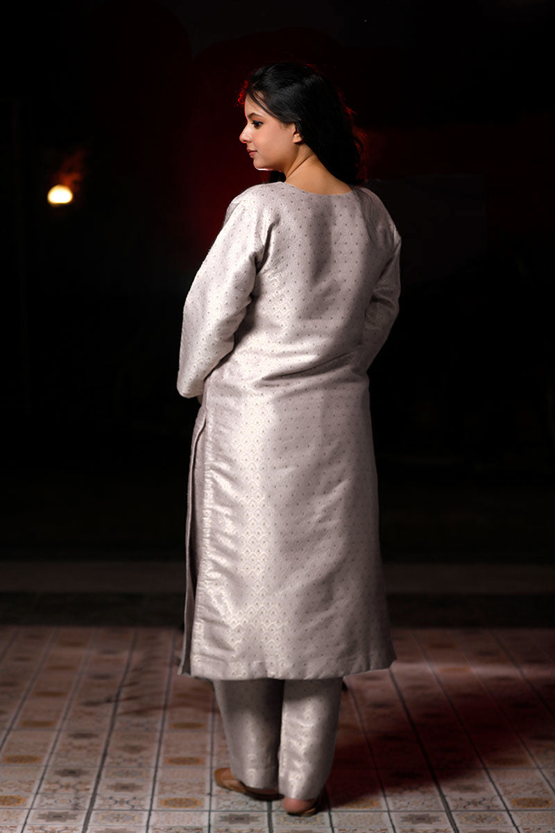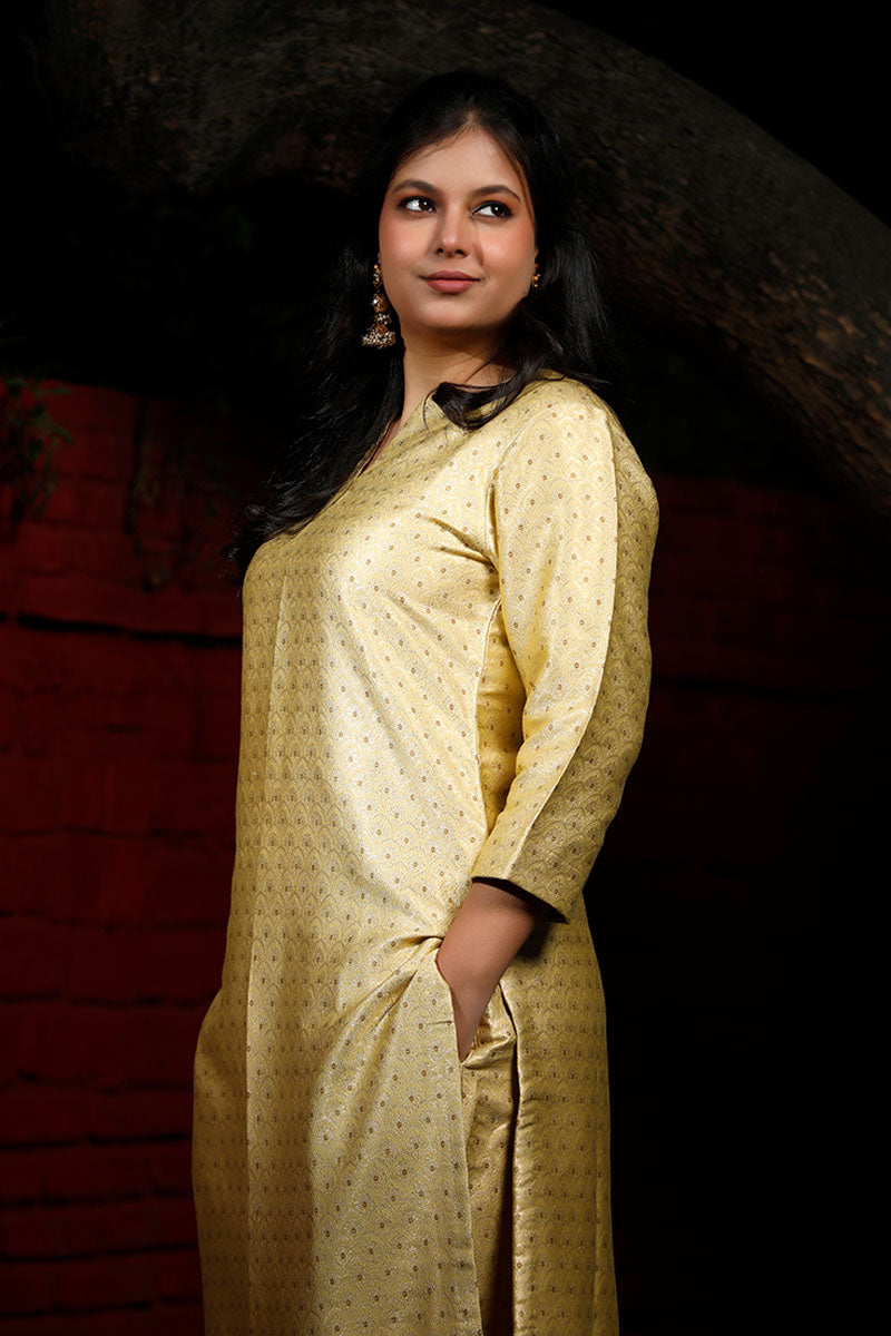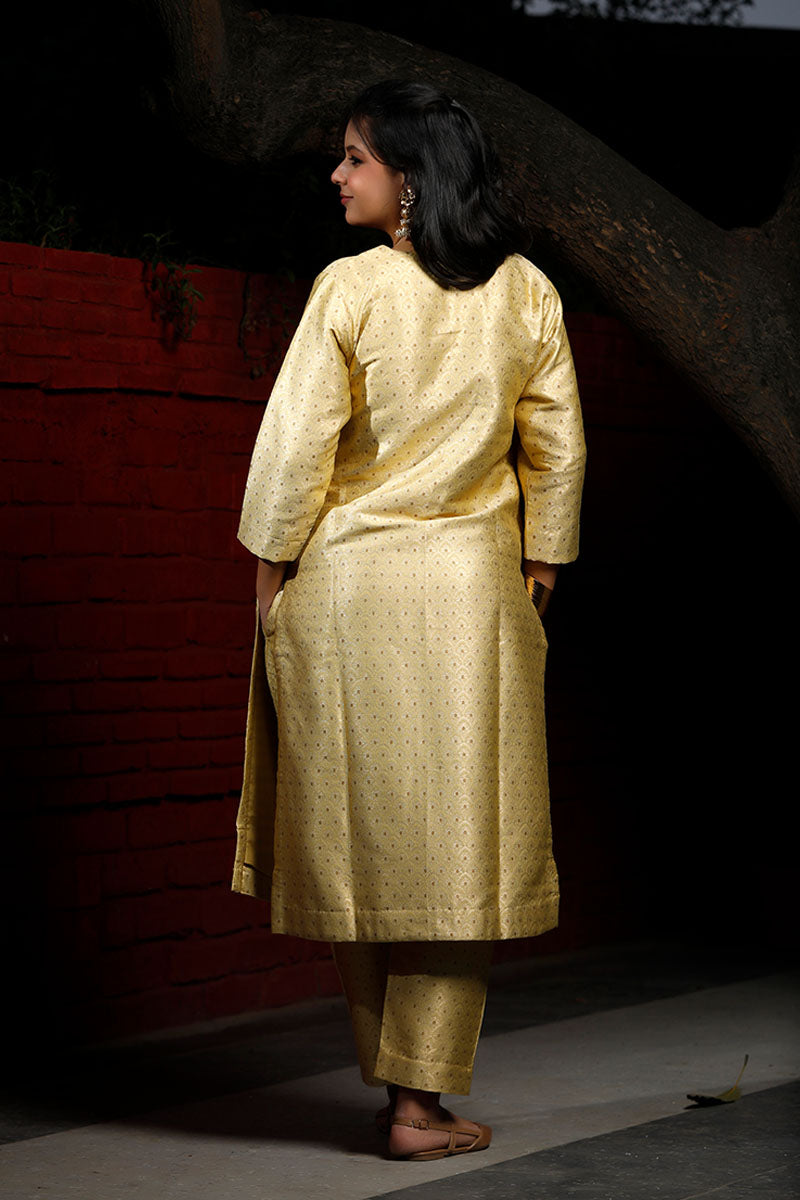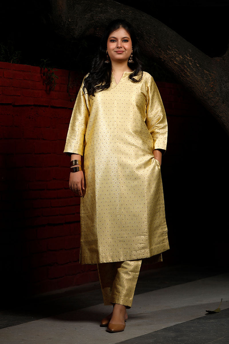 Embrace grace and opulence as this set adds a touch of timeless glamour to your ensemble. Consisting of a straight kurta that is woven with exquisite water gold zari, this set radiates regal charm. Its round V-neck and 3/4th sleeves exude elegance. Paired with coordinated bottoms, this ensemble promises seamless style. Wear it with matching jewellery to look your best.